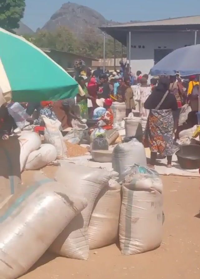 n outdoor market scene with many people and a variety of items for sale. The market appears to be located in a dusty, possibly rural area, with a mountain visible in the background. Many people are gathered under umbrellas and tents, presumably to shield themselves from the sun. Several individuals are examining or purchasing goods, which appear to include grains, seeds, and other agricultural products stored in large white sacks and bowls. The people in the video are primarily dressed in colorful, traditional clothing. There's a lot of activity and movement, indicating a bustling marketplace.
