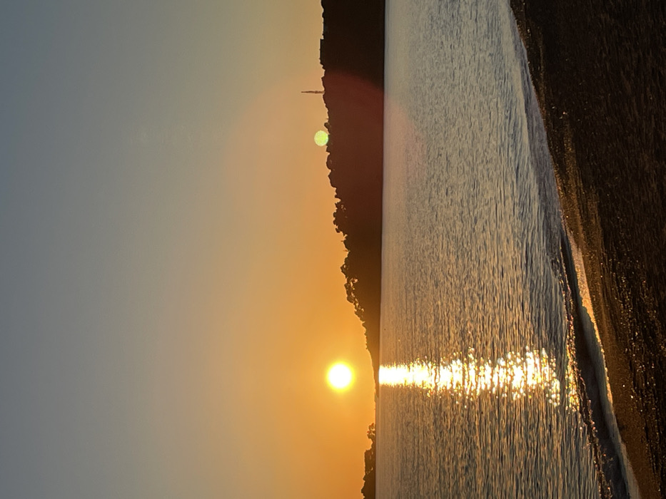 The image depicts a sunset scene from the shoreline of Rafailovići, Montenegro. The sky presents a gradient from light blue at the zenith to vibrant orange and yellow near the horizon, indicative of sunset. The sun, a bright yellow-orange orb, is positioned low on the horizon, slightly left of the image's center. A distinct, shimmering vertical column of sunlight reflects on the calm water surface, extending from the sun towards the foreground. The body of water, likely the Adriatic Sea, shows minimal wave activity, with small waves breaking gently onto the dark, pebbled or sandy beach in the immediate foreground, which occupies the bottom third of the frame. Across the water, a dark, silhouetted landmass, possibly a hill or peninsula, is visible against the bright horizon. This landmass is densely covered with trees, and a slender tower or antenna-like structure, along with indistinct building outlines, can be discerned on its crest. A circular green lens flare artifact is present in the sky above the silhouetted landmass. No individuals, animals, or specific man-made objects are present on the beach or in the visible water.