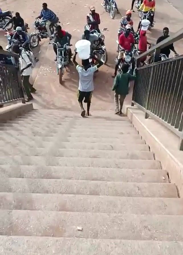 A view looking down a flight of concrete stairs, beside a metal railing, shows multiple men on motorcycles parked at the base of the stairs, some holding white buckets. A young person wearing shorts and carrying a white bucket on their head walks down the stairs toward the motorcycles. Another young person walks down the stairs at the same time. The ground around the stairs and motorcycles appears to be dirt. The scene is brightly lit.