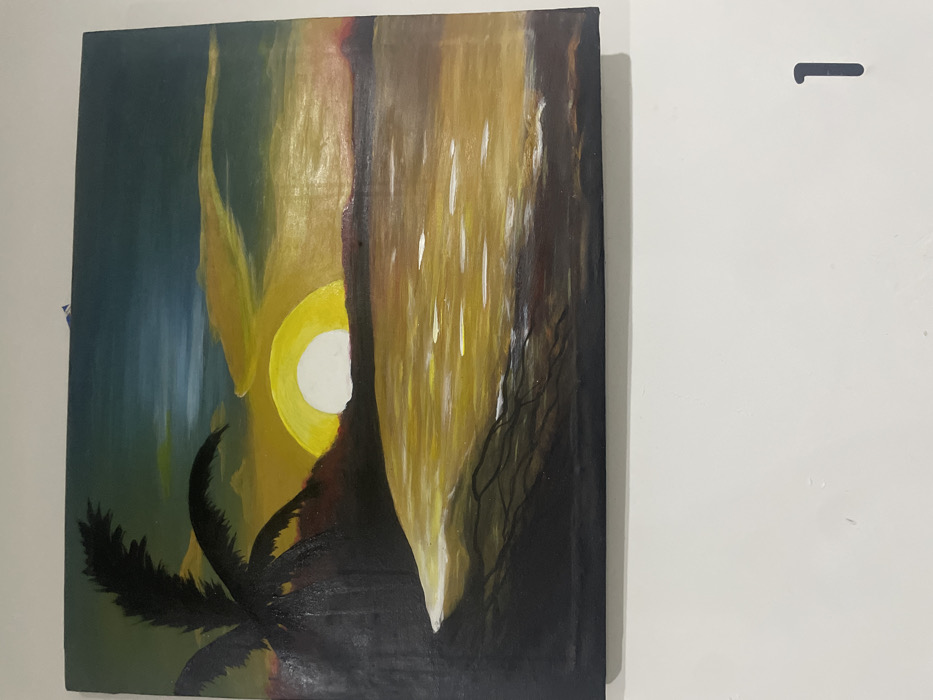 An abstract painting depicts a bright, possibly lunar, orb surrounded by a yellow halo. Dark, vertical strokes suggest trees or foliage. A black palm-like silhouette appears at the bottom, possibly representing more vegetation. The left side features a darker blue-green hue. The painting is displayed on a white wall.