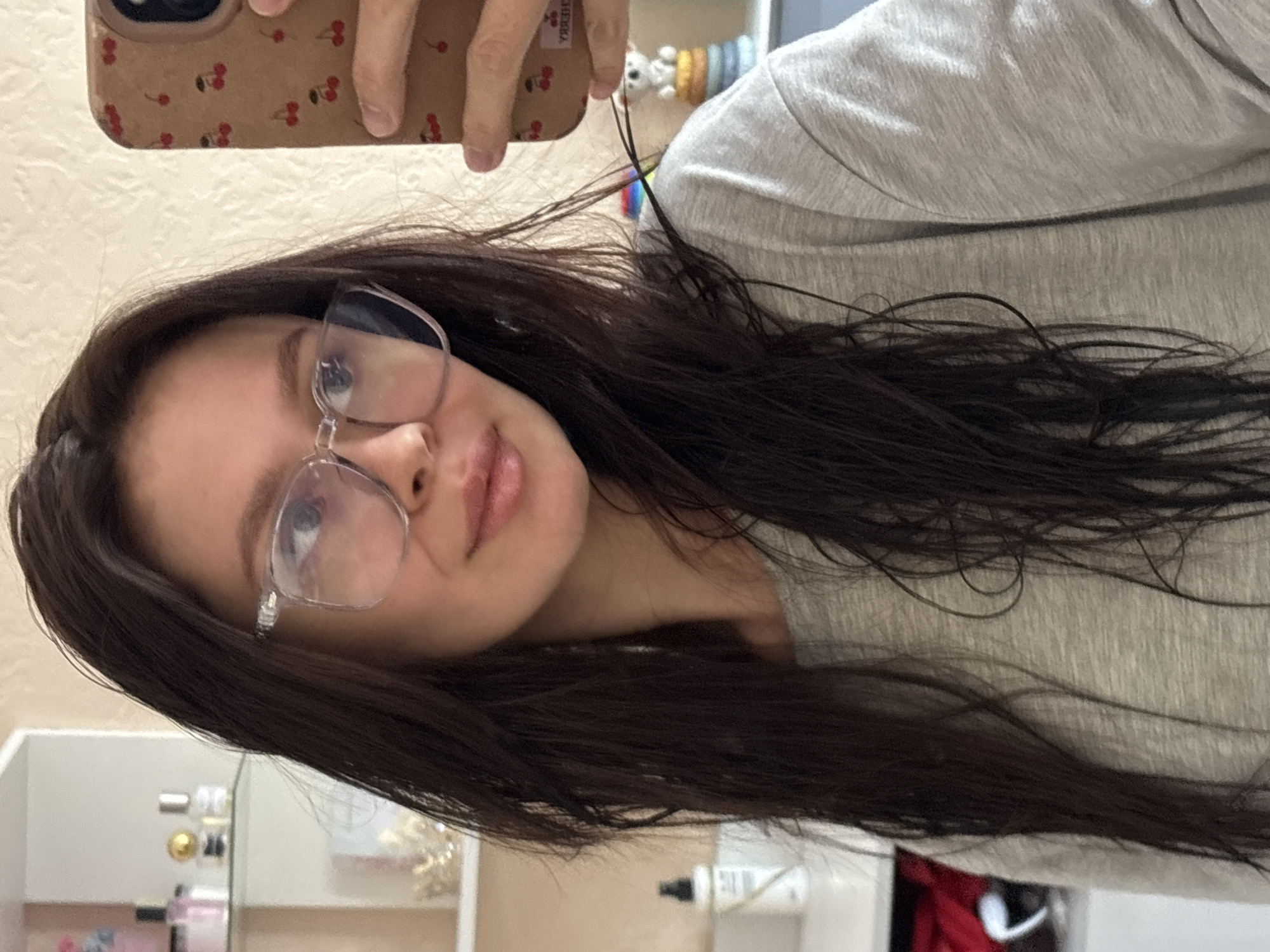 The image captures a selfie portrait of a woman in an indoor residential setting within Chaikovsky, Russia. The subject, a woman with long, dark brown hair appearing damp or recently washed, wears clear-framed rectangular glasses and a light gray crew-neck long-sleeved shirt. She holds a smartphone, partially visible on the right, which has a light brown case adorned with red cherry patterns. Her gaze is directed towards the camera, with a slight, closed-mouth smile. The background on the left features a white wall-mounted shelving unit with two glass shelves displaying multiple perfume bottles (clear, pink, gold-capped) and gold-colored decorative objects. Below these shelves, a white spray bottle stands on a white surface, next to folded red fabric and a partially obscured white object. The wall behind is light-colored and textured. On the right side of the background, a small white figurine resembling a bear rests atop a stack of colorful rings on a white surface. A thin dark cable drapes over the woman's right shoulder.