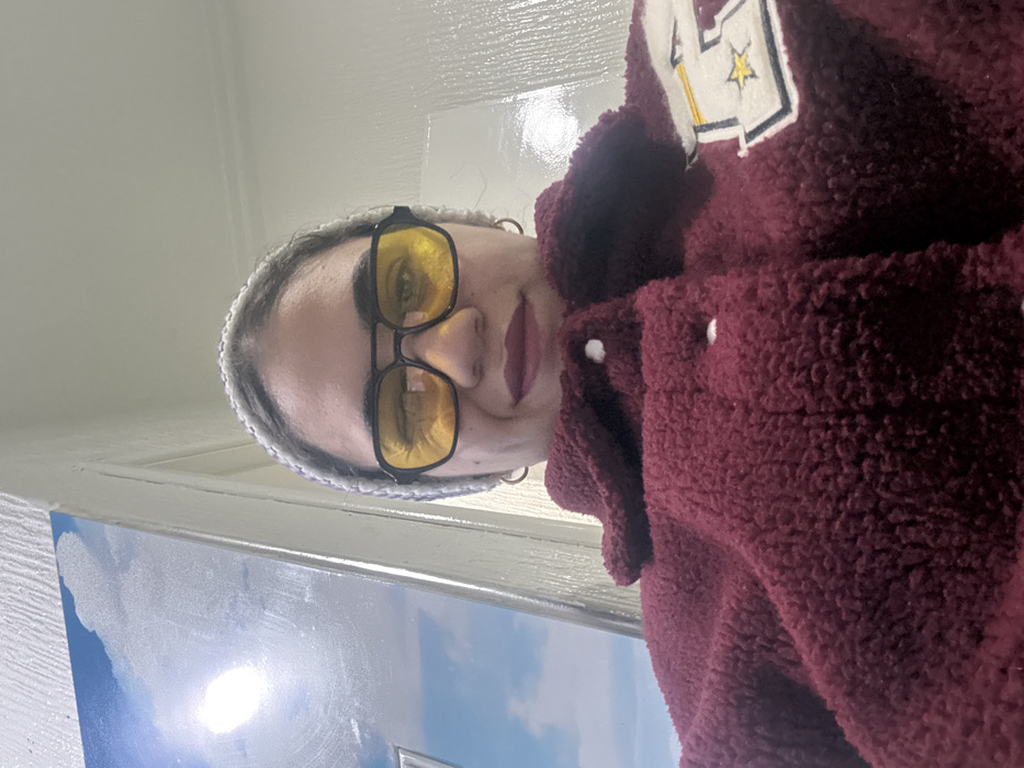 A selfie shows a person wearing a white knit cap, black-framed yellow glasses, and a maroon sherpa jacket. The jacket features a white patch with a yellow star and the letter "H" on the collar. The person has fair skin and is wearing lipstick. The background includes a white door frame and a picture of clouds. The image is slightly tilted.
