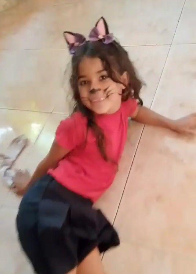 A young girl is lying on a tiled floor. She is wearing a red t-shirt, dark blue shorts, and white socks. She has a pair of cat ears on her head and face paint to resemble a cat, including whiskers. She is smiling at the camera. There is a pair of shoes and socks on the floor near her. The floor is made of light colored tiles.