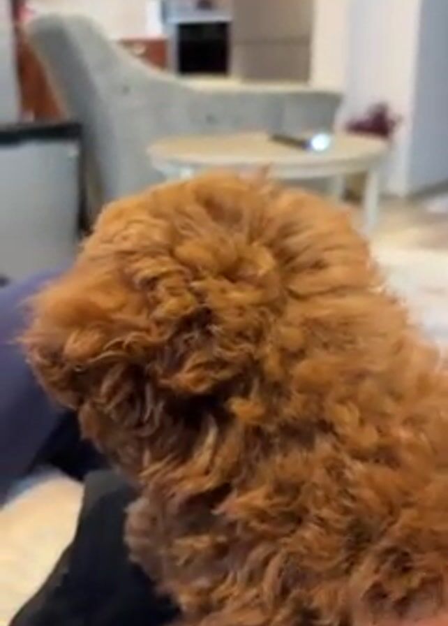 person petting a small, brown, curly-haired dog in a home. The dog is sitting on the person's lap. The person's hand is visible as they stroke the dog's fur. The background includes a living room setting with furniture such as chairs, tables, and a TV. A kitchen area is also partially visible in the background, with cabinets and appliances. The overall setting is a cozy and domestic environment.