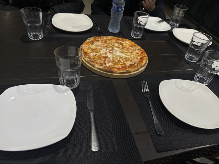 A pizza sits on a wooden board at the center of a dark-colored table. Several white plates are positioned around the table, each accompanied by a glass. Some plates also have a fork and a knife beside them. A water bottle is placed at the head of the table. The setting suggests a group meal is about to be enjoyed.