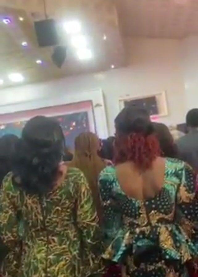 crowd of people standing in a brightly lit room, possibly a church or auditorium. Most of the people are women, and they are wearing colorful, patterned dresses. The camera focuses on the backs of several women in the foreground. One woman has curly red hair and a black head covering. Another woman is wearing a green and gold patterned dress. There is a screen in the background showing a video of a man. The ceiling is white with recessed lighting and a pattern of small squares. The overall impression is that people are gathered for a religious event.