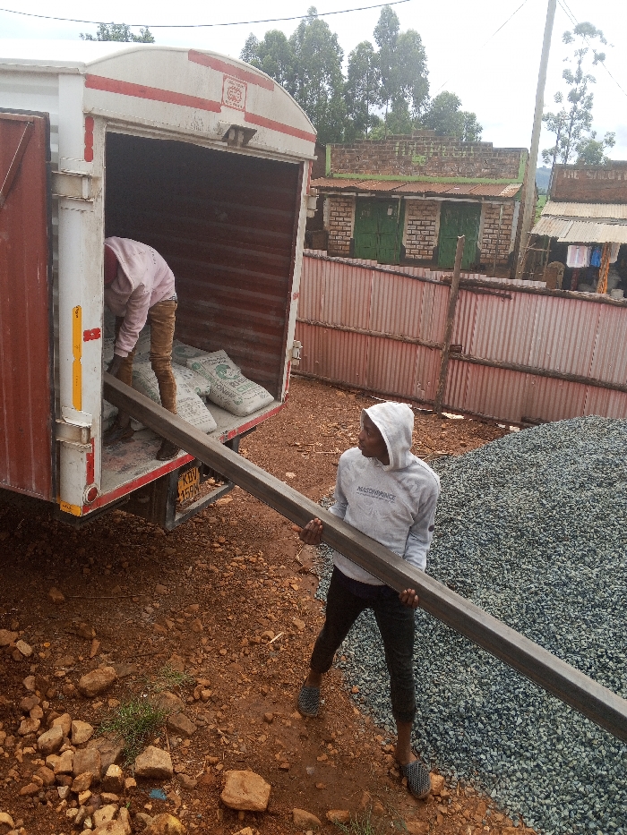 This image depicts an active construction material handling scene in Borabu Chitago ward, Kenya