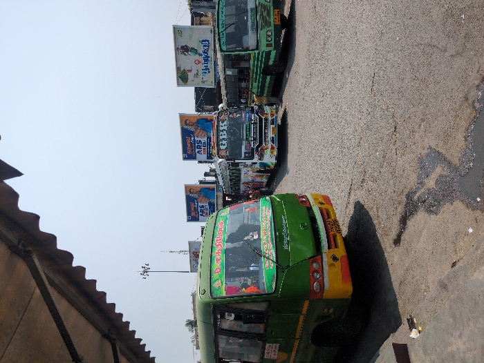 The image captures a daytime scene at a bus stand in Tiruvannamalai, India