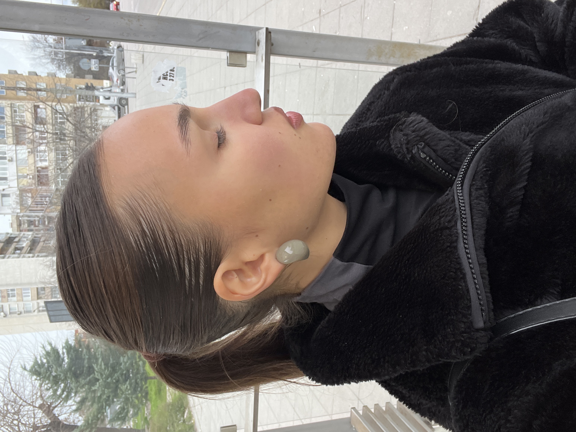 A young woman is seated at what appears to be a bus stop or outdoor waiting area in Plovdiv, Bulgaria. She is seen in profile, facing left, with her eyes closed. The woman has brown hair pulled back into a low ponytail. She is wearing a black fuzzy jacket over a gray shirt, and distinctive gray or pale-colored stone-like earrings. The background visible through the shelter includes buildings, trees without leaves, and other urban features. A sign with text, part of which reads "3 27 B," can be seen on the glass of the shelter. The overall lighting indicates daytime, likely in an urban environment. The focus of the image is the woman's face and upper body.