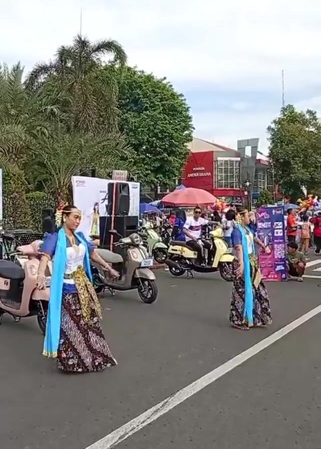 Two young women dressed in traditional Indonesian dance attire perform on a street lined with spectators. They wear blue tops, patterned skirts, and ornate headpieces. Behind them, two light-colored scooters are parked next to a stage setup with a speaker and promotional signage. Further back, a crowd of people is gathered, some standing under a red tent. Buildings and trees surround the scene. A woman in a hijab walks in front of the dancers, holding a phone.