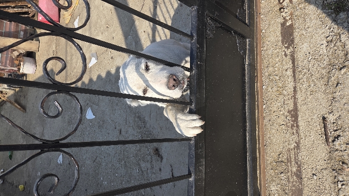 - "The image depicts a white, short-haired dog, possibly a Central Asian Shepherd Dog, positioned behind a dark-colored, ornate wrought iron gate in Dolni Bogrov, Bulgaria" by FM-Mbqt72, licensed under CC BY 4.0