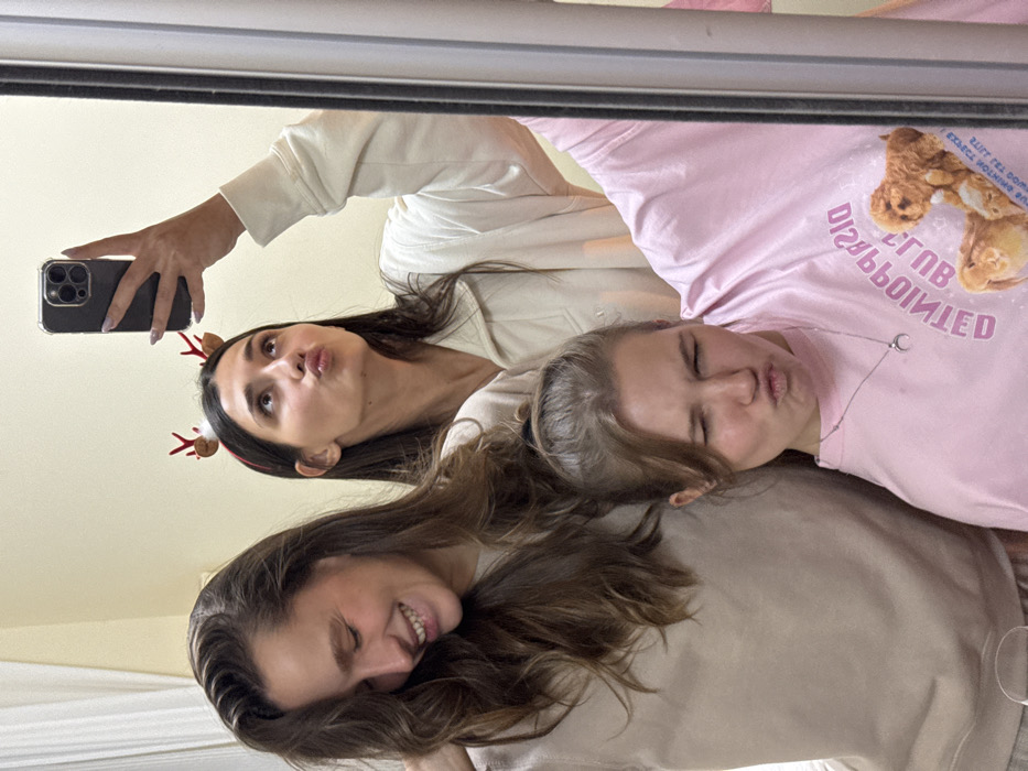 Three young women pose for a selfie in a mirror. The first woman, holding a phone, wears reindeer antlers and puckers her lips. The second woman, clad in a pink shirt with an image of cats, also puckers her lips. The third woman, positioned in the foreground, smiles broadly. The group is casually dressed.