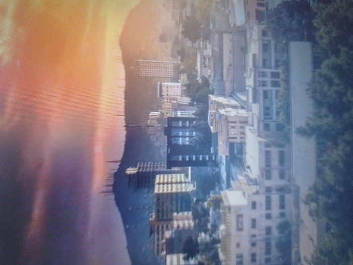 This is an elevated, wide-angle photograph depicting a cityscape in Quetta, Pakistan, under a dramatic sky. The sky transitions from a dark purplish-blue on the left to a bright orange-yellow on the right, indicative of either sunrise or sunset, with visible cloud formations. Vertical line artifacts are present across the entire image, consistent with a photograph of a screen. In the background, a range of hazy, blue-tinted mountains forms the horizon. Multiple tall, slender structures, consistent with communication towers or antennae, are distinctly visible along the mountain ridgelines. The midground features a dense cluster of multi-story urban buildings. A prominent, dark, rectangular high-rise structure is centrally located, flanked by various lighter-colored, multi-story buildings. Towards the right, another tall, slender building with numerous windows is visible. The foreground is dominated by a dense arrangement of lower to mid-rise buildings, primarily light beige or off-white, many featuring flat roofs. A notable block of interconnected structures occupies the central foreground. The bottom of the frame is filled with extensive green tree canopies, partially obscuring the lower levels of the foreground buildings. No individuals, specific vehicles, or discernible actions are observed within the frame.
