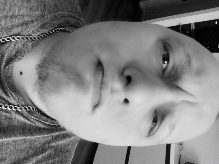 - "A close-up, black and white, low-angle portrait photograph depicts a bald male individual with light facial stubble on his chin and jawline" by FM-5QedD3, licensed under CC BY 4.0