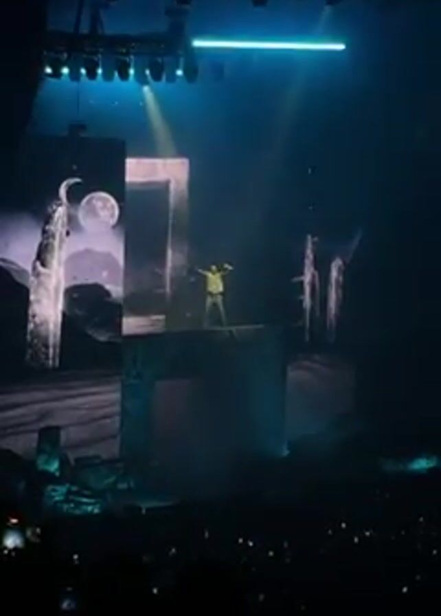A man stands atop a blocky stage in a dark concert hall. He is wearing a light-colored jumpsuit. He holds his arms out. Behind him are large screens with lunar imagery. There are also stage props of rock-like shapes. Above him are blue lights. An audience is visible in the dark foreground, some holding up phones.