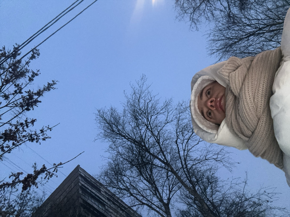 A low-angle selfie captures a person bundled in a white hooded jacket and beige scarf, positioned on the right