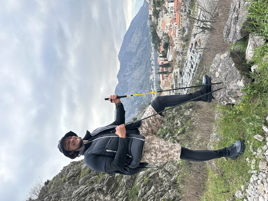 A male subject stands on a rocky, grassy incline overlooking the city of Dobrota, Montenegro