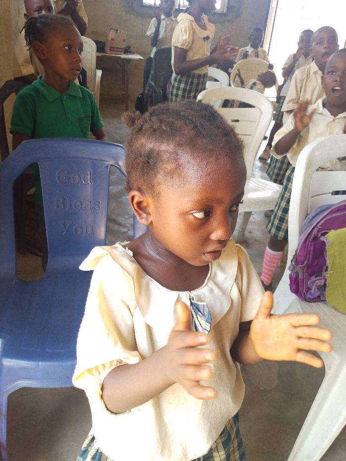 The image displays an indoor scene with approximately ten young Black children, aged 4-10 years, in a city of Unknown, Unknown. In the immediate foreground, a child, likely female, wears a light cream short-sleeved top with a ruffled collar and a blue, white, and yellow plaid skirt. Her hands are raised, palms open, suggesting a clapping motion, and her gaze is directed towards the right. Her skin appears somewhat shiny, and a faint white mark is visible on her neck. A blue plastic chair with "God Bless You" embossed on its backrest stands to her left. In the midground and background, other children, mostly dressed in similar light-colored tops and plaid bottoms, are actively clapping or singing; one child on the far right has an open mouth. Some children are seated on white plastic chairs, while others stand. A purple backpack rests on a white chair in the midground-right. A wooden table is visible against a plain, light-colored wall in the background-left. Natural light enters the functional, sparsely decorated room from a window in the background.