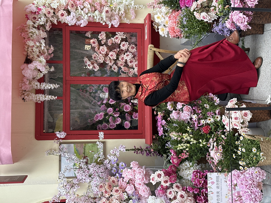 - "An elderly East Asian woman is centrally seated and smiling directly at the camera in a vibrant artificial floral display in Liangjiang, China" by FM-rOW8f1, licensed under CC BY 4.0