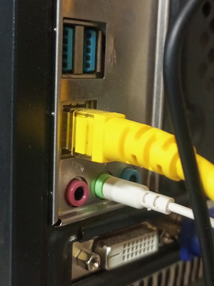 The rear panel of a computer tower features various ports. A yellow Ethernet cable is plugged into the top port, while a white cable is connected to the green audio output. Pink and blue audio ports are visible. Below these are a DVI and a VGA port. Two USB 3.0 ports are located above the Ethernet port. Dust is present on the surfaces and inside the ports.