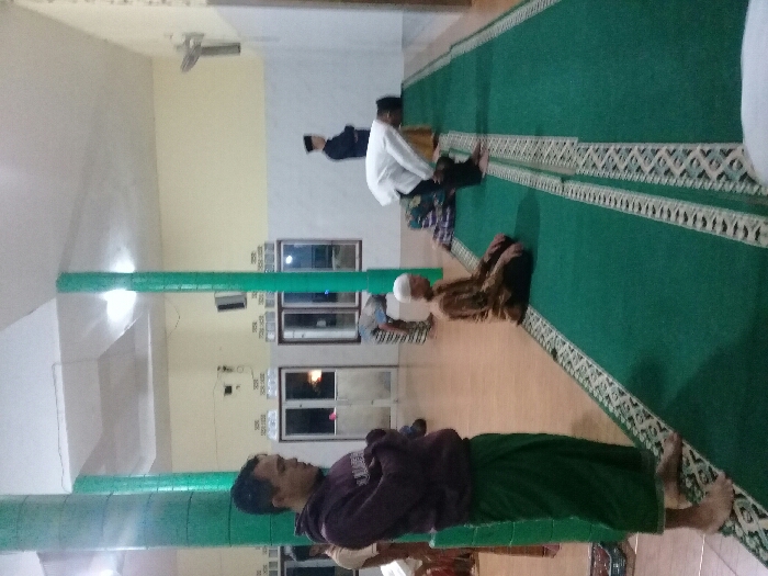 interior of a mosque. There are several people praying on a green carpeted floor. The people are all wearing traditional Islamic clothing. The mosque has white walls and a green tiled ceiling. The walls are lined with windows. The image was taken from a low angle, looking up at the ceiling. The location of the mosque is unknown, but the coordinates given are (latitude: 666, longitude: 666), which are invalid. There are two large green pillars visible in the foreground. Two men are praying on the floor while a third man stands in the center of the image. There are windows on the left wall. The bottom left corner of the image shows the lower half of a man standing with a dark shirt and green pants, facing the right. He is looking at the camera. He has his right foot slightly raised and is standing on the floor. The image is taken from a low angle. It is unclear what the people are doing in the image.