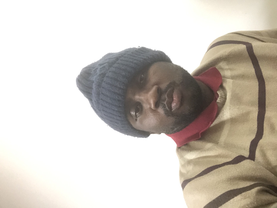 An adult male with dark skin and a short beard is depicted from the chest up in a portrait-oriented photograph