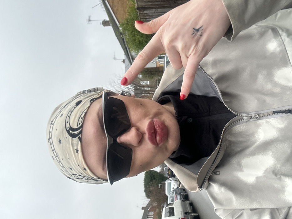 A female subject is depicted in a close-up, waist-up view, positioned outdoors on a residential street in Wealden, United Kingdom, under an overcast sky. She wears a beige bandana with a dark pattern of stars and crescent moons, dark wraparound sunglasses with a light upper frame, a black high-collared zipped top, and a light beige or silver-toned zippered jacket. Her lips are pursed. Her left hand is raised, displaying red fingernail polish, and is positioned in the 'rock on' gesture with the index finger and pinky extended. A small, dark, abstract starburst or propeller-like tattoo is visible on the back of her left hand. The background reveals a residential street with multiple parked vehicles, including a light-colored van, along the left side. Residential houses with brick facades, visible roofs, and chimneys are present on both sides of the street, accompanied by sparse vegetation.