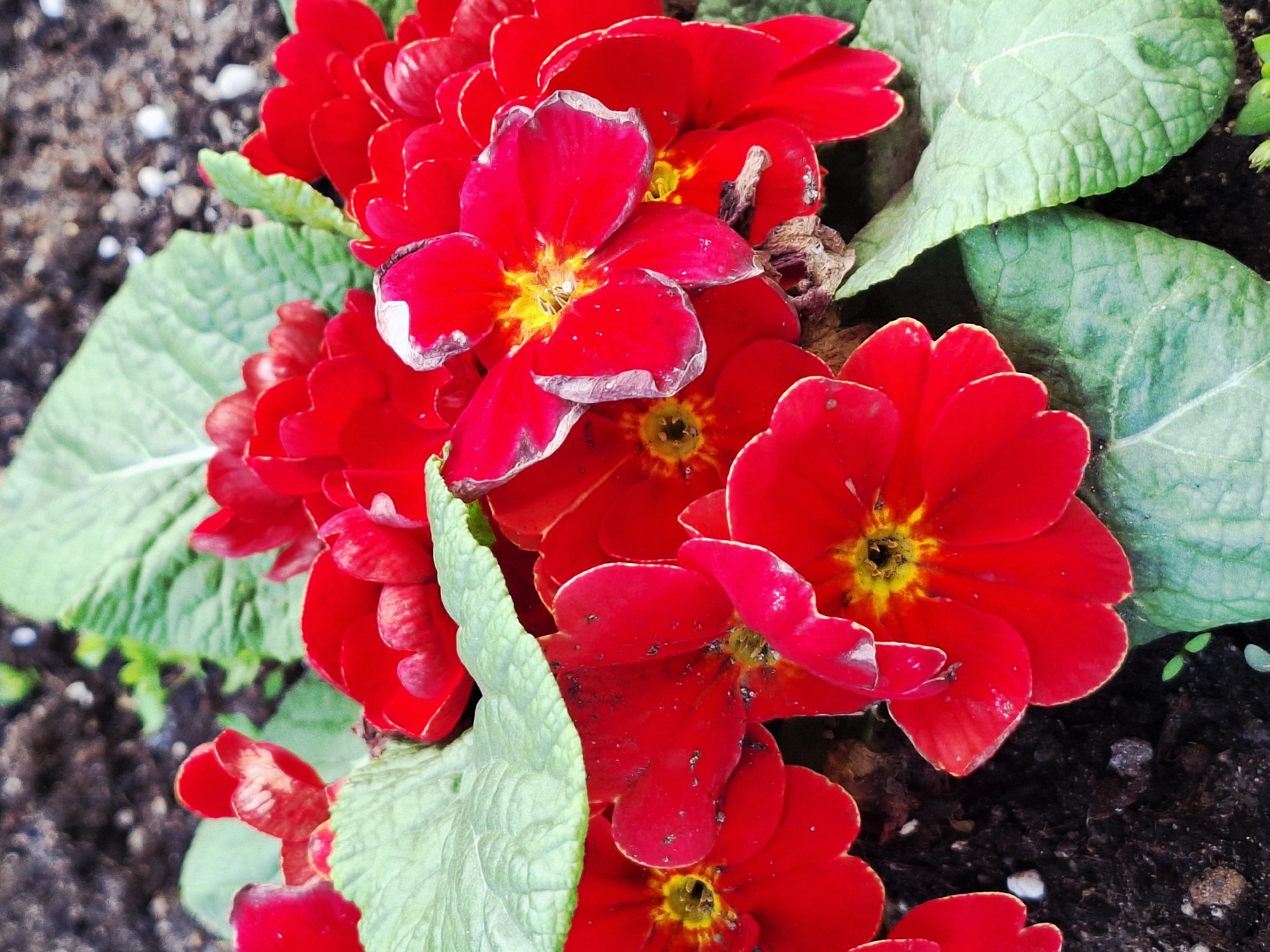 cluster of red primrose flowers with green leaves growing in soil. Some of the petals appear slightly damaged with white edges. The background consists of dark soil mixed with lighter-colored particles.