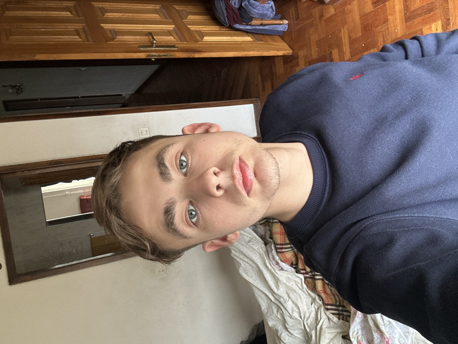 A young man with fair skin, light brown hair, and green eyes poses for a selfie. He's wearing a navy blue sweatshirt with a small red logo on the chest. The background includes a wooden door, a mirror reflecting a room with a bed, and rumpled bedding in a plaid pattern. The photo is taken at a slightly tilted angle.
