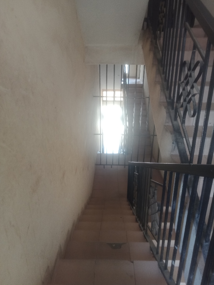 This image displays an interior stairwell within a building in the city of Gandu Albasa, Nigeria, viewed from an elevated perspective looking downwards