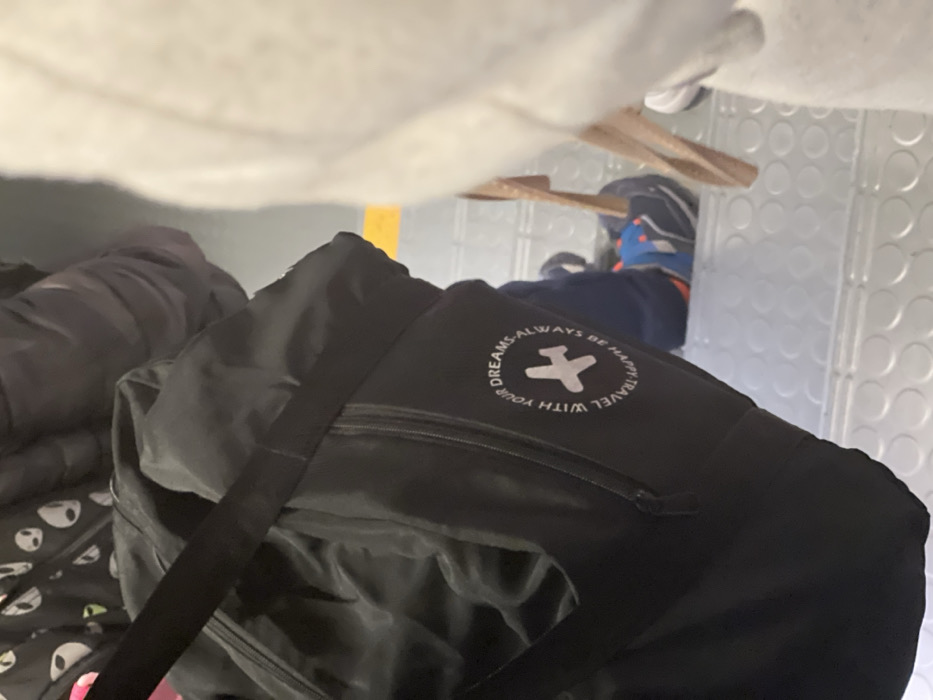 A black travel bag with a logo featuring an airplane encircled by the words "DREAMS - ALWAYS BE HAPPY TRAVEL WITH YOUR" dominates the foreground. Partially visible, a child's legs wearing blue socks and sneakers are tucked in the top corner. Additional luggage, including a bag with an alien-themed pattern, sits alongside the black bag. The background suggests a space with white, textured panels. Above, blurred white clothing obscures part of the scene.