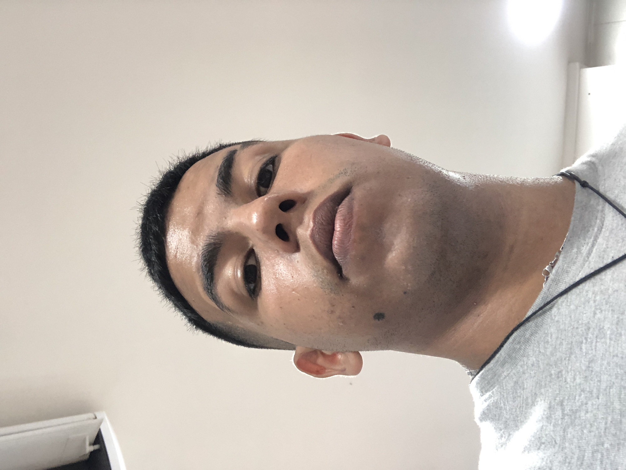 A close-up, upward-angle photograph shows a man's face and upper torso. The man has dark hair, dark eyes, and medium skin. He is wearing a grey t-shirt and a necklace. A mole is visible on his neck. The background appears to be a plain, light-colored wall and part of an air conditioning unit. There is nothing in the image to indicate the location is Juan Griego, Venezuela.
