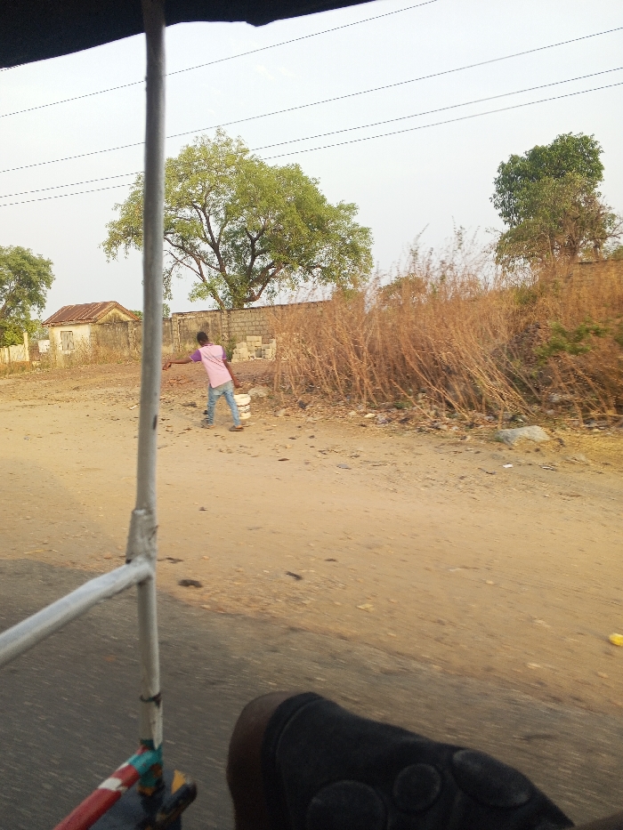 The image depicts a roadside scene in Lokoja, Nigeria, observed from inside a moving vehicle. In the foreground, a white metallic frame, consistent with a vehicle's structure, extends from the lower left towards the upper left. A dark shoe or boot with circular raised patterns is partially visible in the lower right corner. The immediate road surface beneath the viewpoint transitions from asphalt to dry, light brown dirt. In the midground, a male individual, appearing to be an adult, is positioned on the dirt shoulder. He wears a short-sleeved pink t-shirt and light blue jeans. He is captured in motion, leaning forward and to his left, with his right arm extended outwards and slightly downwards, as if gesturing or throwing. His left hand is holding a white bucket or container, positioned near his left leg. The ground around him is dry, light brown dirt with scattered debris, including small rocks and possibly litter. To the right of the individual, a dense patch of tall, dry, golden-brown weeds or grass covers an elevated area. Behind this vegetation, a low wall constructed from unpainted concrete blocks is visible. The background features a large tree with dense green foliage in the center-left. To its left, a small, weathered building with a rusty, corrugated metal roof and faded light-colored walls is partially visible, showing a small, dark window opening. Further to the right in the background, another tree with green foliage stands behind the dry weeds. The sky is a uniform light gray, indicating an overcast or hazy condition. Multiple thin, dark lines, consistent with overhead power lines, traverse the upper portion of the frame horizontally.
