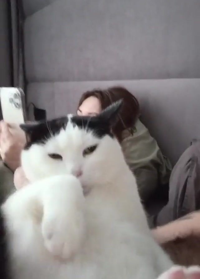 A woman is lounging on a gray upholstered headboard, using her smartphone. Foregrounded is a large black-and-white cat lying on its back, looking directly at the camera, with its paws up in the air. The cat meows.