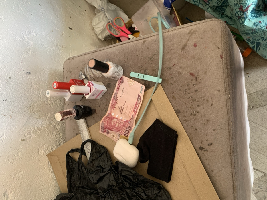 The image displays a cluttered surface, likely a worn, stained greyish-brown upholstered cushion or furniture top, positioned against an off-white, textured wall with minor discolorations. On the surface, from left to right: a crumpled black plastic bag rests on a light brown cardboard sheet. Adjacent to the bag, a white Apple AirPods charging case is visible, with a light blue charging cable plugged into it. Next to the AirPods case is a small, folded piece of black fabric. A 200 Nigerian Naira banknote, featuring a portrait and the denomination "Two Hundred Naira N200", lies flat. The light blue charging cable extends across the surface and is secured by a light green plastic cable tie or clip. Further right, several bottles of nail polish are arranged: one dark bottle with a light-colored cap, one white square bottle with a red top, one small red bottle, one white square bottle heavily stained with red polish, and one light-colored bottle with a dark cap. A silvery object, possibly a nail file, is partially visible. The cushion itself is marked with numerous dark spots and reddish-pink stains, consistent with nail polish spills. In the upper right background, a white plastic bag is partially visible. To the far right, below the level of the cushion, a pair of pink-handled scissors and other items are visible within a container. The presence of the Nigerian Naira banknote confirms the setting as Nigeria. The image does not contain visual identifiers specific to the city of Jos within Nigeria. No people are present. The scene suggests a personal grooming or casual work area.