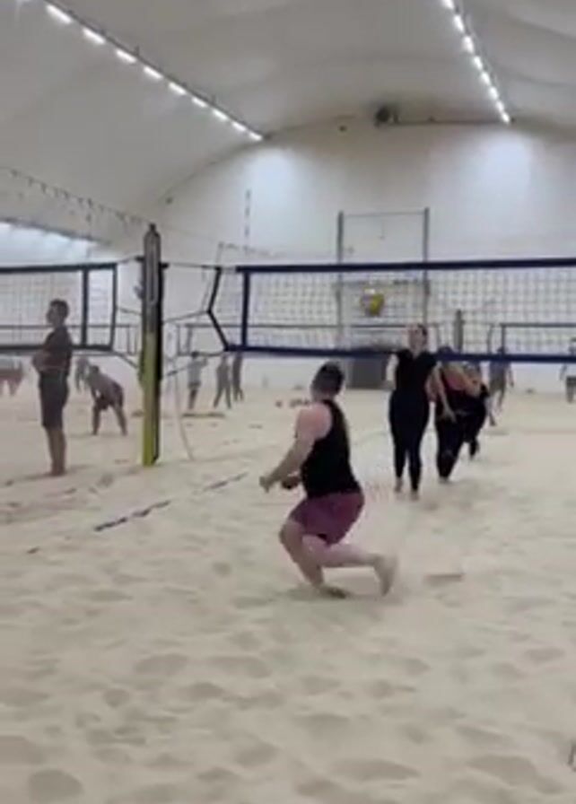 man playing beach volleyball in an indoor arena. The man, wearing a black tank top and maroon shorts, attempts to hit the volleyball and dives in the sand. He ends up lying on his back after the dive. The volleyball net is visible and other people are playing volleyball in the background. The arena is well lit with white lights.