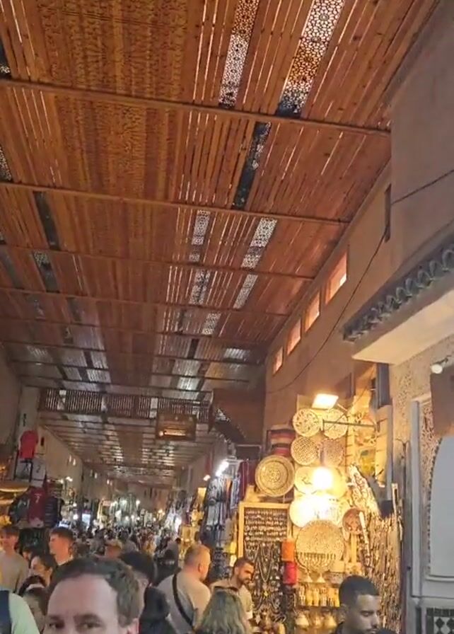 Here's a concise description of the video: The video shows a crowded marketplace in Marrakech, Morocco. A narrow street is packed with people browsing shops on either side. The shops display various goods, including brassware, ceramics, and clothing. Above, a wooden slat roof with decorative cutouts provides shade. The scene is well-lit and appears to be taken in the evening. People are walking in both directions through the bustling market.