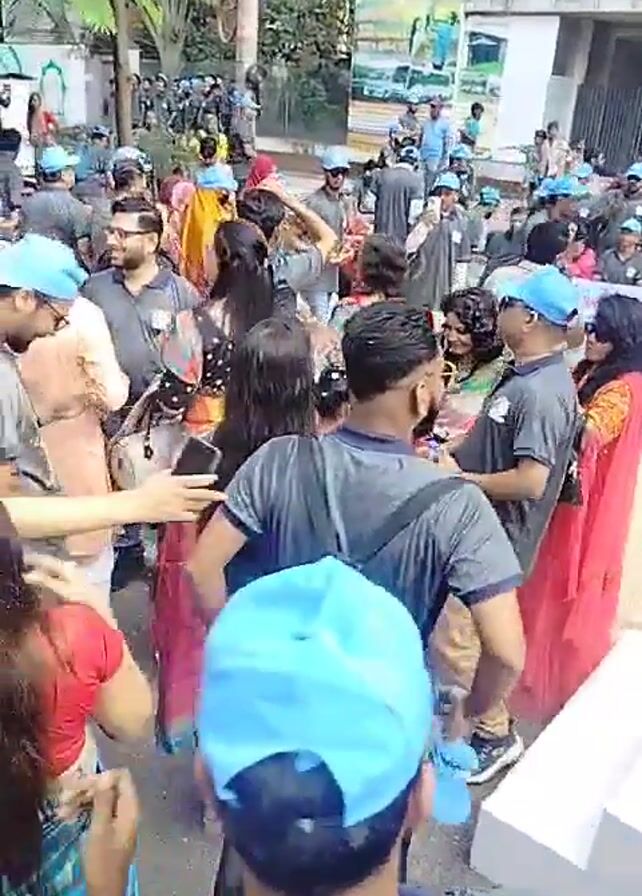 group of people gathered outside, many wearing matching light blue baseball caps and grey t-shirts. Some of the women are wearing colorful saris. People are talking, walking, and moving around in a somewhat crowded space. There are trees and buildings in the background, and a small Bangladeshi flag is visible attached to someone's clothing. The atmosphere appears festive and social, with music playing in the background.