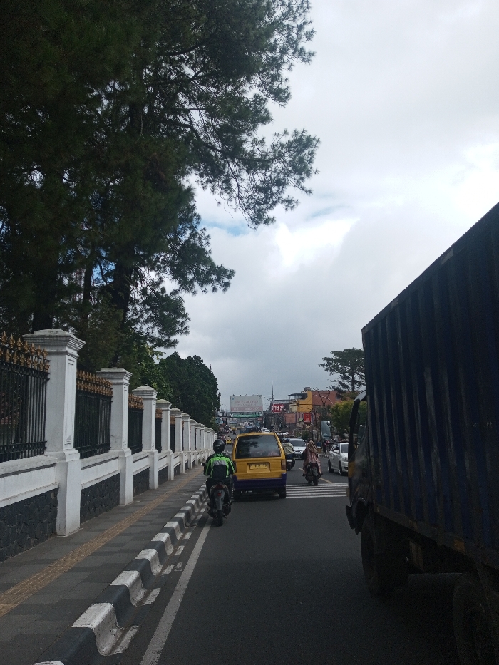 The scene, located in Thotagamuwa, Sri Lanka, depicts a busy urban street under an overcast sky. In the immediate foreground on the right, a dark blue commercial truck's cargo box and rear wheel are partially visible, indicating its presence in the rightmost lane or shoulder. To the left, a pedestrian sidewalk runs alongside the roadway, bordered by a decorative white concrete fence featuring regularly spaced pillars and ornate black wrought iron panels with gold embellishments. Tall evergreen trees with needle-like leaves rise prominently in the upper left portion of the frame. The asphalt road features a black-and-white striped concrete barrier or curb segmenting the shoulder from the main traffic lanes. A motorcyclist wearing a green jacket is positioned just past this barrier on a dark grey motorcycle. Further down the road in the midground, a yellow compact van with a visible rear license plate is present in a traffic lane. To its right, another motorcyclist, partially obscured and appearing to wear a head covering, is situated on what appears to be a pedestrian crossing marked by diagonal white lines on the road. Multiple additional vehicles, including cars and other light vehicles, are visible further in the distance, indicating active traffic. The background shows a collection of buildings, utility poles, streetlights, and billboards, suggesting a developed commercial or residential area.