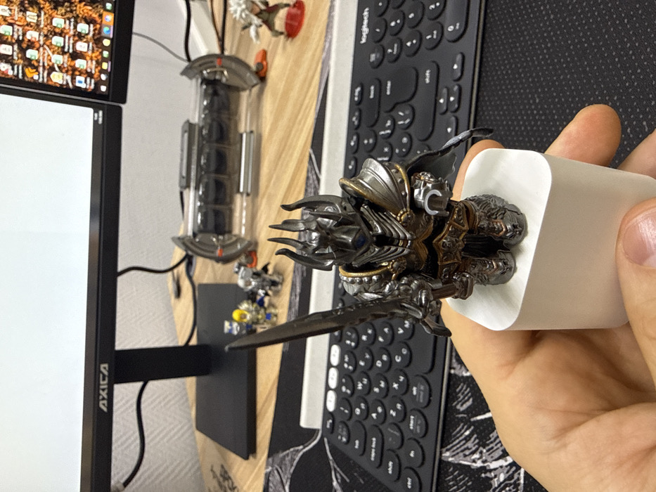 An indoor scene displays a desk setup, predominantly focused on a miniature figure held by a person's right hand. The figure, resembling Arthas Menethil as the Lich King, is silver and gold armored, features a horned helmet with a blue gem, and wields a dark grey sword. It stands on a white, rectangular block, which is gripped by the individual's fingers. In the foreground, a black Logitech keyboard rests on a black mousepad adorned with a subtle grey and white patterned design. The underlying desk surface is light-colored wood. Behind the primary figure, on the desk, several smaller objects are visible: two miniature figures (one with a yellow helmet, one grey armored), and a grey, tubular multi-compartment storage object. To the far right, another miniature figure with spiky white hair stands on a red circular base. The background is dominated by a black computer monitor, displaying the "AXICA" brand name on its bezel. The screen is largely white, with a section on the right exhibiting a desktop wallpaper composed of numerous application icons against an orange and brown textured background. Electrical cables are visible behind the monitor stand. No specific visual markers within the image allow for the identification of a precise location within the city of Krasnoyarsk, Russia; the scene presents as a generic domestic or office interior.