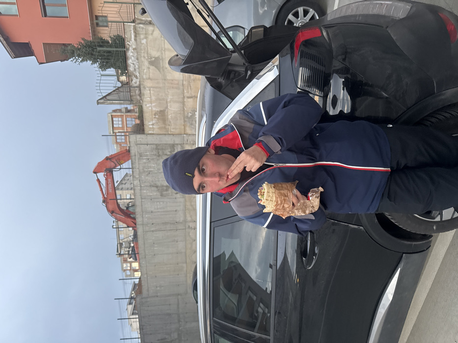 A male individual is depicted standing outdoors, leaning against the rear passenger side of a black SUV with its tailgate open. The man, appearing to be in his twenties, wears a dark blue beanie with a yellow accent, a blue winter jacket with red and white detailing, and black trousers. He is actively eating a large, cylindrical food item wrapped in brown paper, consistent with a kebab or shawarma, holding it in his right hand. His left hand's fingers are at his mouth, suggesting he has just taken a bite or is bringing food to his mouth. His facial expression is neutral, with his mouth slightly open. The immediate foreground shows a paved surface, likely a parking area. In the background, behind the man and the SUV, a tall concrete retaining wall is visible. Above this wall, a large orange Hitachi excavator is prominently positioned, indicating ongoing construction or earthworks. Several multi-story buildings, some appearing new with visible brickwork, are present behind the excavator and further in the background. To the far right, a red-orange building with balconies and a green conifer tree is visible. The sky is overcast and grey. The overall scene is consistent with an urban or semi-urban environment in Blagoevgrad, Bulgaria, likely an area with ongoing development. A grey sedan is partially visible behind the black SUV to the right.
