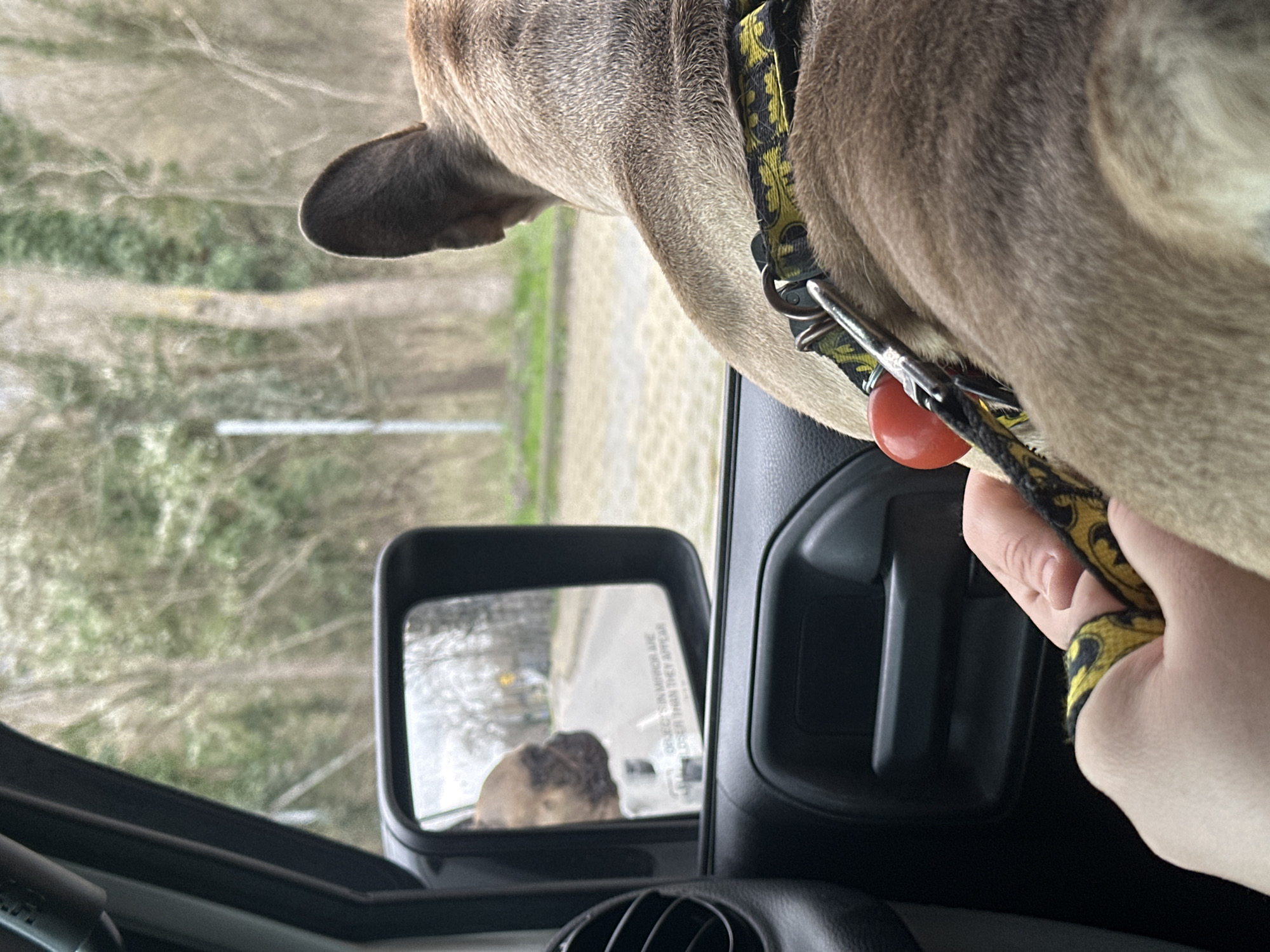 interior of a car. A large, light-brown dog is partially visible in the foreground, its head and neck extending towards the top of the frame. The dog is wearing a black and yellow patterned collar with a red tag. A person's hand is holding the dog's leash near the car's interior door handle. A side mirror is visible in the lower left, reflecting the dog's head and a white wall in the background. The background seen through the car window shows trees and a beige wall. The location cannot be confidently determined to be Varna, Bulgaria, based on the image alone.