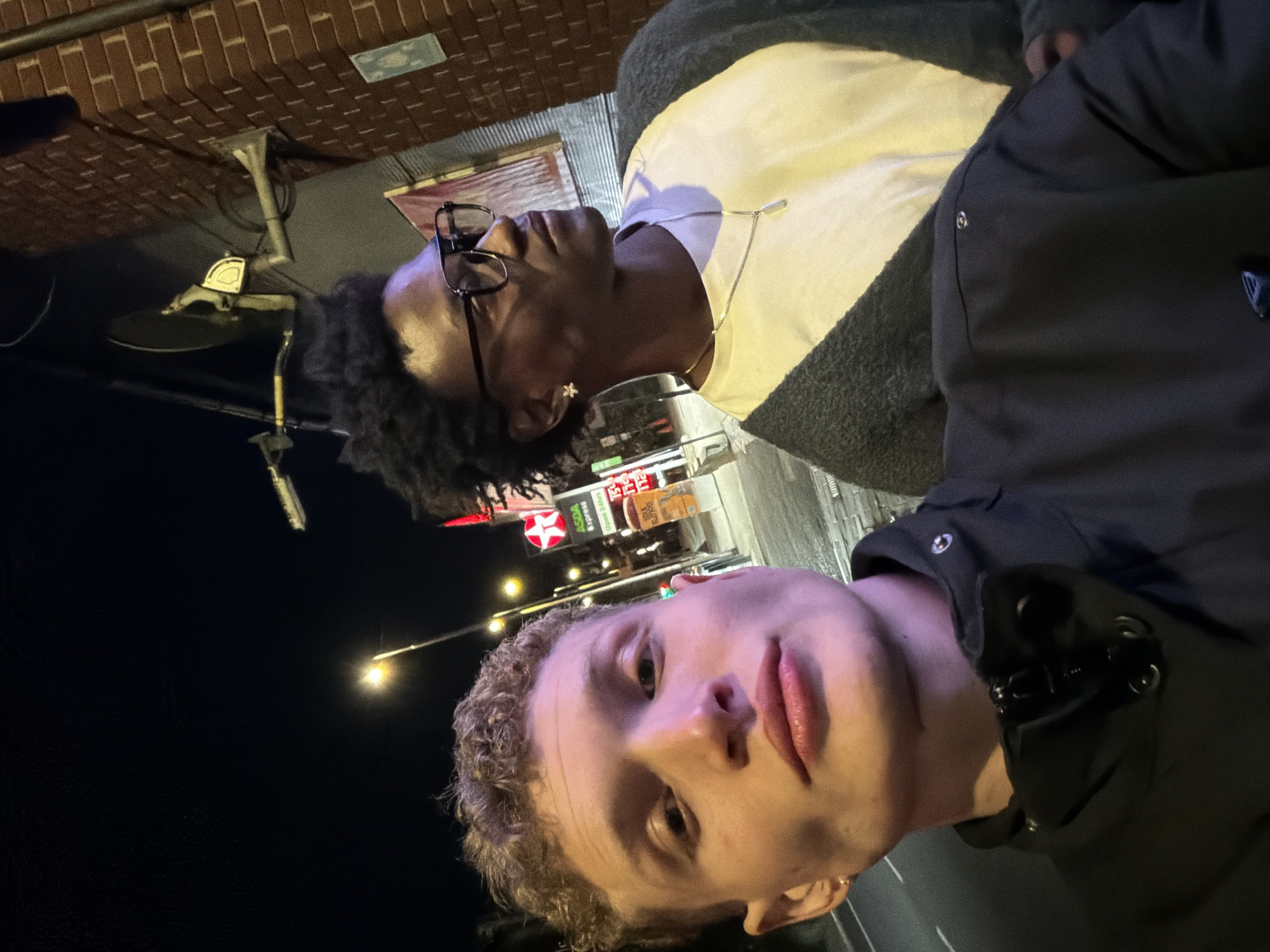 Two individuals are depicted in a selfie-style photograph. One person, with light skin and short curly hair, is positioned in the foreground. The second person, with dark skin and wearing glasses, is in the background. Both individuals are wearing dark-colored outer garments. The background shows an urban environment at night, with streetlights and what appears to be a gas station, indicated by illuminated signs and the red 'Texaco' star logo. The scene suggests the photograph was taken in London, United Kingdom, given the Texaco brand gas station presence there. A brick building or structure can also be observed in the top left.