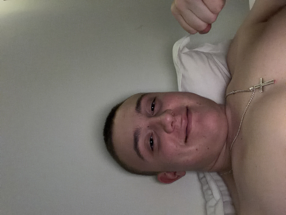 The image displays a young male subject in an indoor setting, identified as Ravda, Bulgaria. The subject is bare-chested with short, dark hair, looking directly at the camera with a closed-mouth smile. He is wearing a silver-colored chain necklace featuring a cross pendant. A white pillow supports his head, and white bedding is partially visible beneath him. The subject's right hand (viewer's left) is clenched into a fist, positioned near his shoulder. The background consists of a plain, light-colored wall.