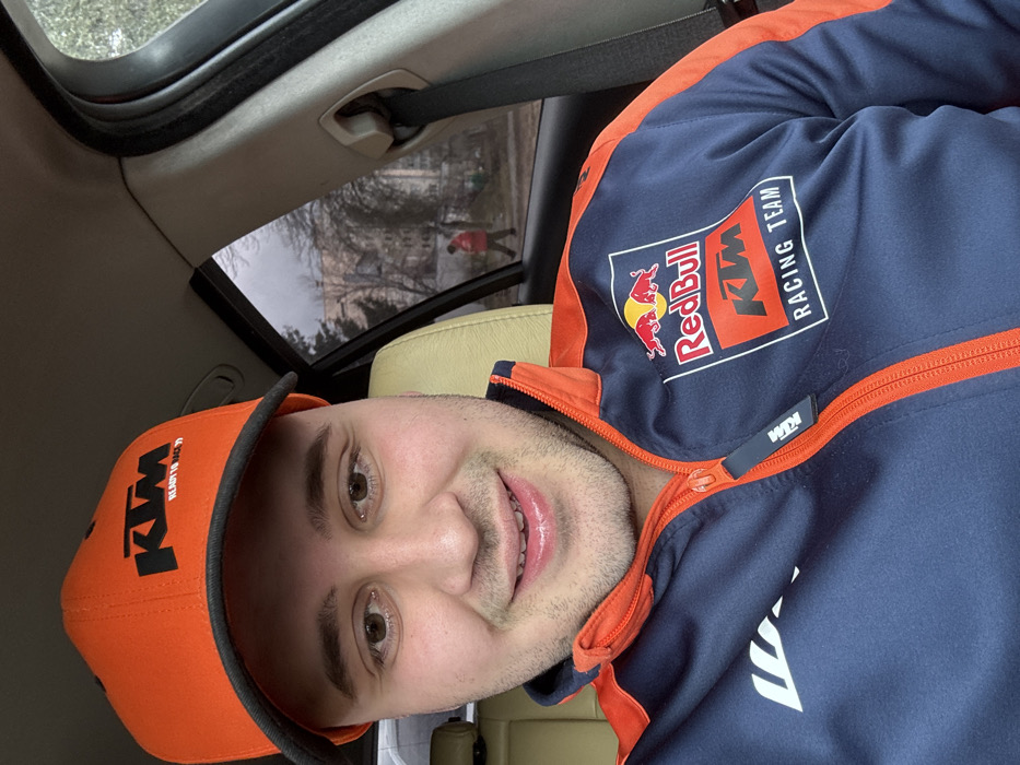An individual is depicted seated in the front passenger seat of a vehicle in Samokov, Bulgaria. The subject is a male, appearing to be a young adult, with short dark hair and visible stubble. He is smiling slightly, revealing his upper teeth. He wears an orange baseball cap with a black brim, featuring a black "KTM" logo and "READY TO RACE >>" text on the front. His attire also includes a navy blue track jacket with orange shoulders, collar lining, and a full-length orange zipper. A small black tag with the "KTM" logo is attached to the zipper pull. On the right chest area of the jacket, a patch displays the "Red Bull" logo above a white rectangle containing "KTM RACING TEAM" text. A partial white logo is visible on the left chest. The vehicle's interior features a light beige or tan headrest and a grey-white ceiling liner. A dark grey seatbelt is visible on the right side of the frame. Through the vehicle's side window, an exterior scene under an overcast sky is visible. Bare-branched trees suggest late autumn or winter. In the background, a light-colored multi-story building with visible windows is present. A single distant individual, wearing an orange or red jacket and dark pants, is observed walking on a path or shoulder next to what appears to be a road.