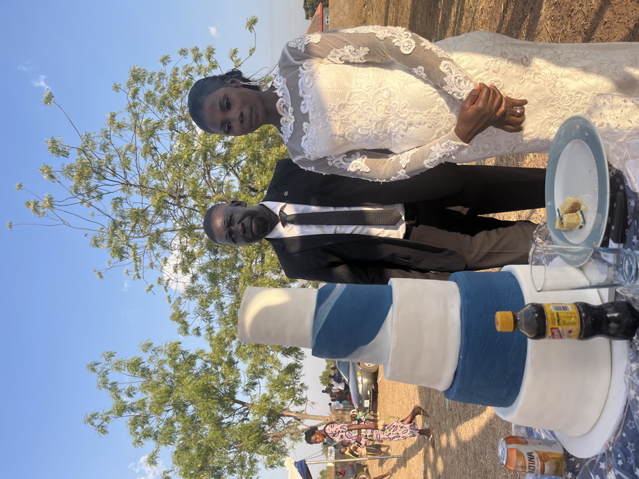 An outdoor event, likely a wedding or reception, is depicted under a clear blue sky in an open, dusty field within the city of Unknown, Nigeria. In the foreground, a five-tiered wedding cake, predominantly white and blue, stands on a table covered with a white cloth patterned with dark stars. The cake features solid blue and white tiers, with some white tiers adorned with blue wavy or swirled patterns. Adjacent to the cake on the table are an open silver can labeled "ALTINA," a small plastic bottle containing a dark liquid with a yellow cap, and an empty clear drinking glass. A light blue-rimmed plate with two small cut pieces of cake and crumbs is also on the table. To the right of the cake stands a dark-complexioned male, dressed in a black suit, white shirt, and dark tie, with a serious expression. To his right, a dark-complexioned female, wearing a long-sleeved white lace wedding gown, stands with her hands clasped in front of her, displaying a neutral expression. A ring is visible on her left ring finger. The immediate ground is dry, reddish-brown earth. In the mid-ground and background, several green-leafed trees are visible. Further in the background, a light-colored sedan and several indistinct individuals are present, along with a partial white tent structure on the far left. A low building with a dark roof is faintly visible on the distant right horizon.
