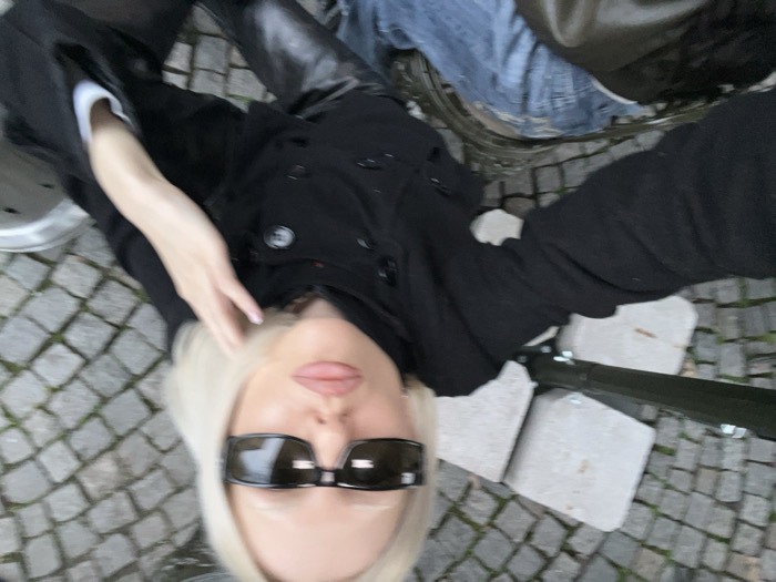 The image depicts an individual from a high-angle, downward-facing perspective in an outdoor urban environment. The subject has blonde hair, light skin, and wears dark rectangular sunglasses. The lips are full and tinted light pink. Attire consists of a dark, double-breasted coat or jacket with multiple buttons, a visible light-colored sleeve cuff, and blue denim jeans with apparent distress or rips. The subject's left hand, featuring light pink or nude nail polish, is positioned near the left side of the head/neck area. The ground is paved with grey cobblestones. A dark metal structure, resembling a railing or bench support, extends horizontally across the mid-left of the frame, with two light-colored, square blocks visible behind it. A dark bag or object is partially visible at the bottom left. While the cobblestone paving and urban furniture are consistent with public areas in Sofia, Bulgaria, a precise location within the city cannot be definitively identified from the visible elements.