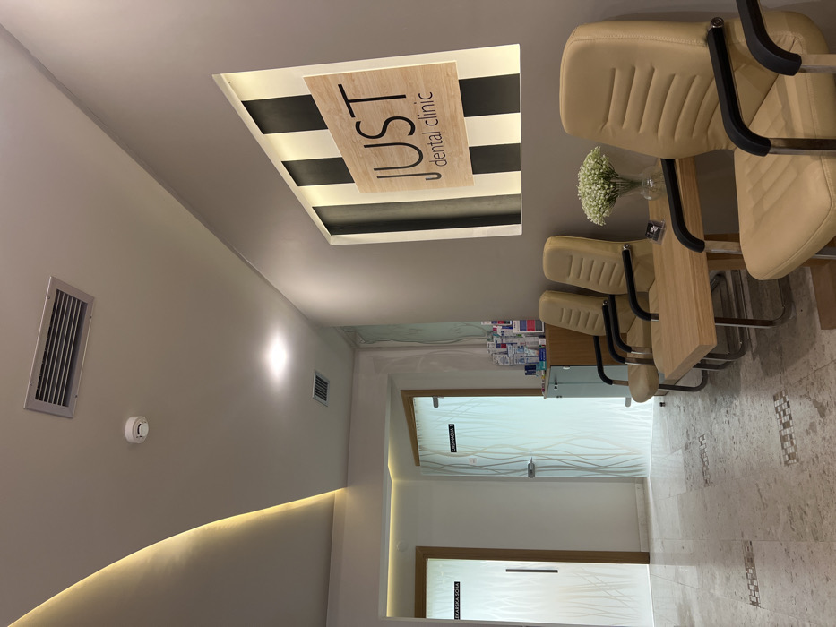 This image captures the interior of an unoccupied waiting room at "JUST dental clinic" in Bar, Montenegro