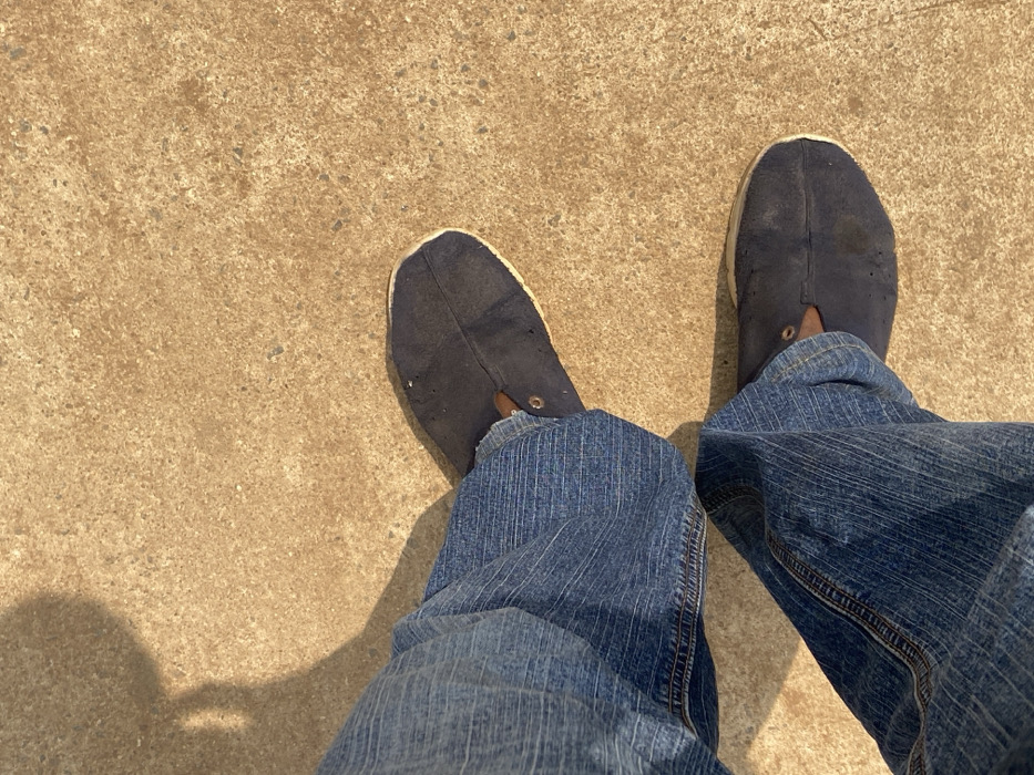 - "The image depicts a top-down view of a person's lower legs and feet standing on a light brown, granular ground surface, consistent with concrete or asphalt, in the city of Igbessa, Nigeria" by FM-u9mLB2, licensed under CC BY 4.0