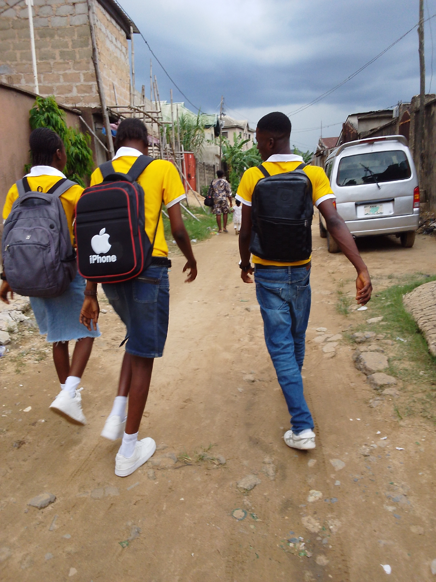 Three individuals are walking on a dirt road in Aba, Nigeria. The three individuals are wearing yellow shirts with white collars. The individuals are all wearing backpacks. Two of the individuals are wearing blue skirts. One individual is wearing blue jeans. The backpacks of the individuals are different colors. There is a silver van in the background. In the distance, a fourth person is walking away from the group.